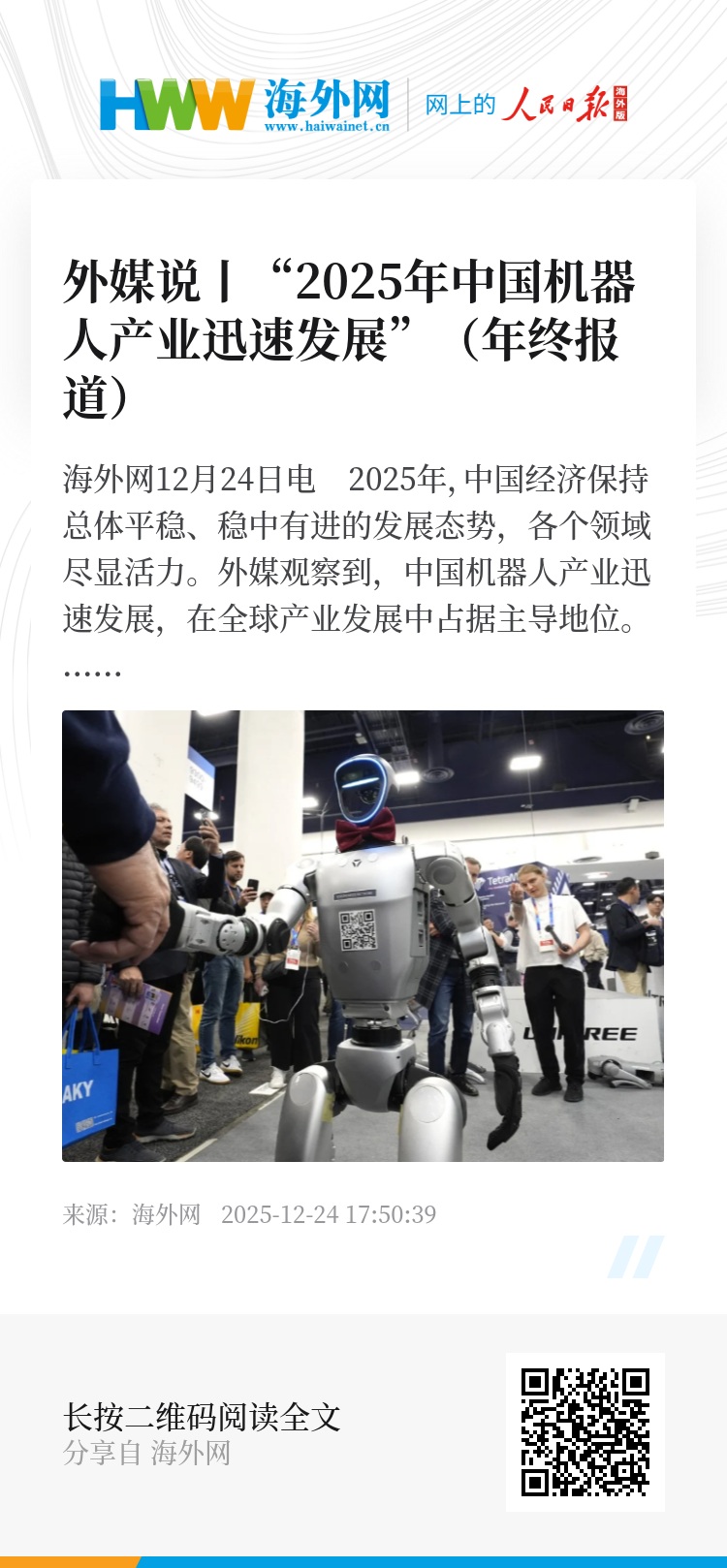 海外网12月24日电 2025年,中国经济保持总体平稳、稳中有进的发展态势,各个领域尽显活力。外媒观察到,中国机器人产业迅速发展,在全球产业发展中占据主导地位。
