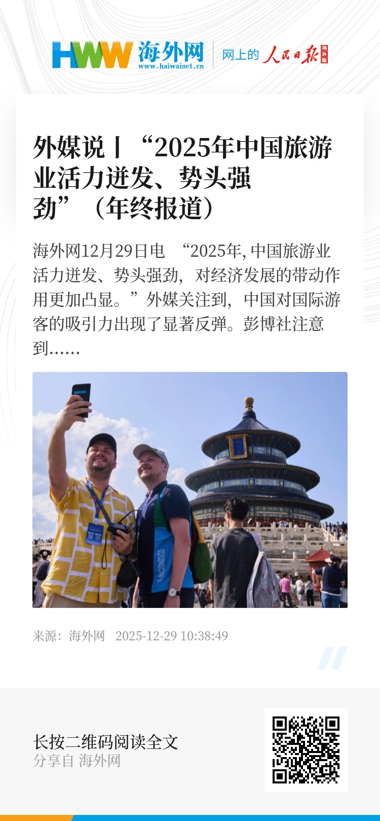 海外网12月29日电 “2025年,中国旅游业活力迸发、势头强劲,对经济发展的带动作用更加凸显。”外媒关注到,中国对国际游客的吸引力出现了显著反弹。