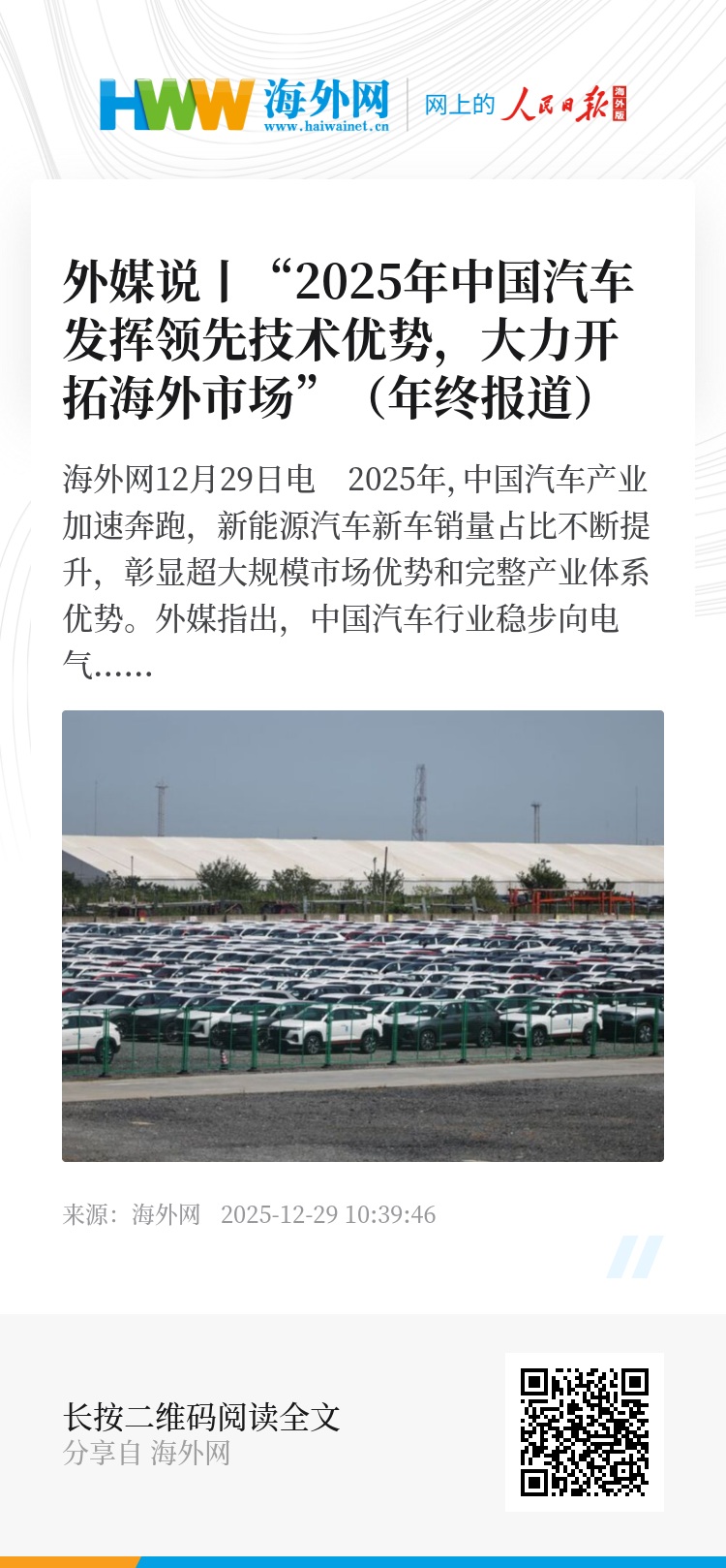 海外网12月29日电 2025年,中国汽车产业加速奔跑,新能源汽车新车销量占比不断提升,彰显超大规模市场优势和完整产业体系优势。外媒指出,中国汽车行业稳步向电气化转型,同时大力发挥技术优势开拓海外市场。