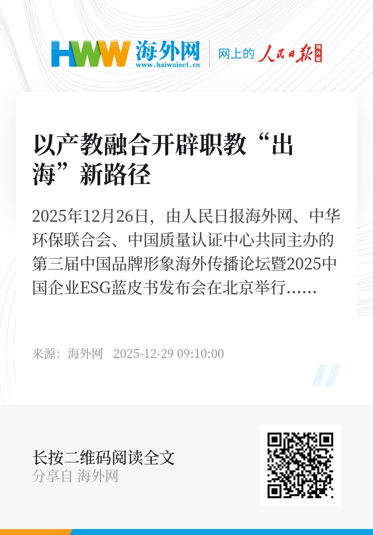 2025年12月26日,由人民日报海外网、中华环保联合会、中国质量认证中心共同主办的第三届中国品牌形象海外传播论坛暨2025中国企业ESG蓝皮书发布会在北京举行。深圳职业技术大学国际交流与合作处处长王冰峰向人民日报海外网表示,“在职教出海的实践中,深圳职业技术大学捕捉全球产业发展动态。例如,中国新能源汽车出口迎来爆发式增长,海外生产基地却普遍面临技术工人短缺的难题,当地相关人才培养更是存在产业匹配度低、专业师资匮乏、实训设施不足等诸多痛点。洞察这一市场需求后,学校顺势而为,将新能源汽车领域列为职教出海的重点方向,主动对接海外产业端的人才需求。”