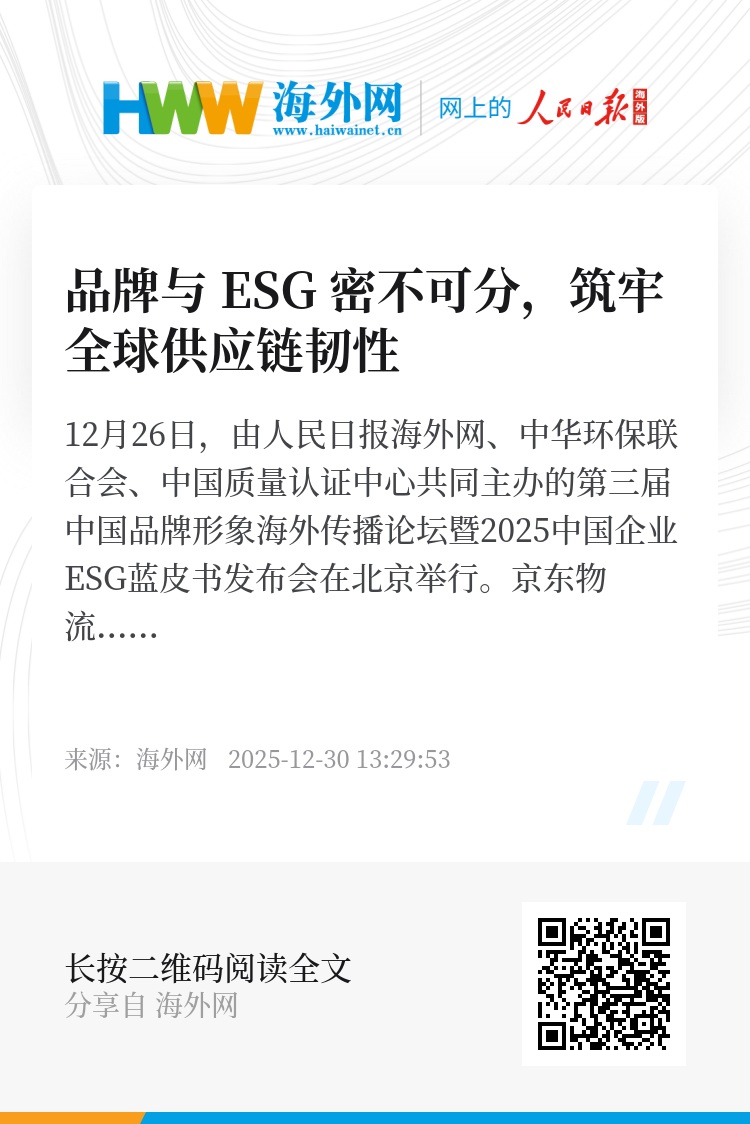 12月26日,由人民日报海外网、中华环保联合会、中国质量认证中心共同主办的第三届中国品牌形象海外传播论坛暨2025中国企业ESG蓝皮书发布会在北京举行。京东物流股份有限公司可持续发展高级总监邓文杰在论坛上表示,“对京东物流来说,品牌与 ESG 密不可分。”