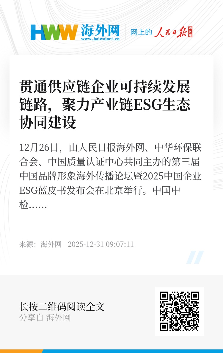 12月26日,由人民日报海外网、中华环保联合会、中国质量认证中心共同主办的第三届中国品牌形象海外传播论坛暨2025中国企业ESG蓝皮书发布会在北京举行。中国中检ESG创新中心执行副主任、中国质量认证中心认证处副处长刘欢介绍:“在全球产业链供应链不确定性风险加剧、可持续发展压力攀升的背景下,中国中检构建了供应链企业可持续价值评价体系(EcoVESS),全面衡量供应链企业可持续表现,并联合20家机构推出我国首个面向供应链可持续领域的综合性服务平台——中国可持续供应链服务平台 (CSSCP),帮助中国企业更好地融入全球价值链竞争。”