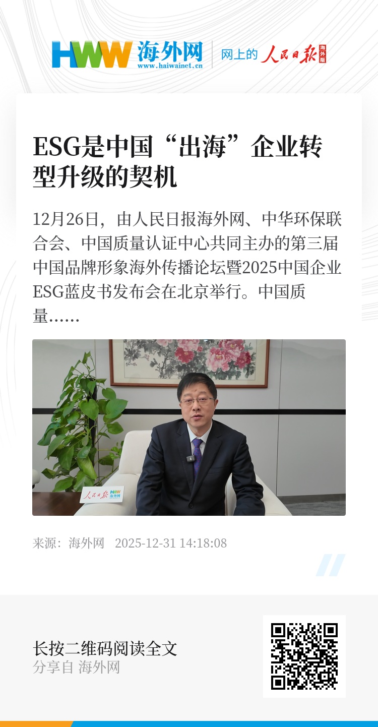 12月26日,由人民日报海外网、中华环保联合会、中国质量认证中心共同主办的第三届中国品牌形象海外传播论坛暨2025中国企业ESG蓝皮书发布会在北京举行。中国质量认证中心党委副书记、主任刘江向人民日报海外网表示,ESG作为海外市场的通用语言,是企业“出海”的重要机遇。综合来看,ESG不是中国“出海”企业的额外负担,而是转型升级的契机。