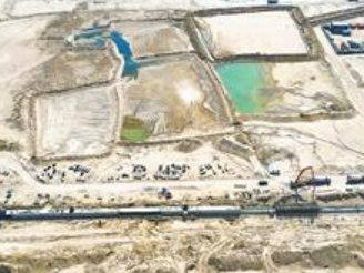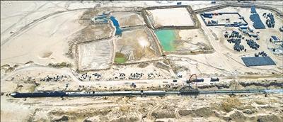 经过多方研究,项目最终摸索出了6套降水(降低水位)方案,分别运用于不同工况。为了保护周围的土壤及生态平衡,还采用了“地表回灌”措施:在降水管沟附近,用沙围出一个水池,收集泵站抽出的地下水;这些水通过地表慢慢渗入地下,实现地下水的平衡;渗透的余水则用于路基和管沟回填的拌和用水,也解决了沙漠地区取水难的问题。项目还建有一套小型海水淡化设备,将地下水处理后用于混凝土等要求淡水施工的部位。