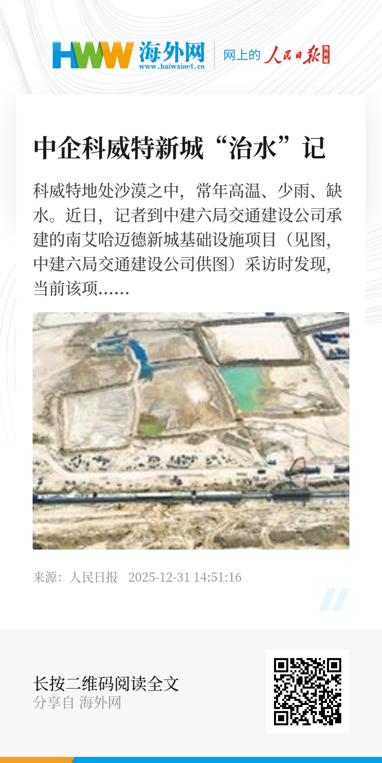 科威特地处沙漠之中,常年高温、少雨、缺水。近日,记者到中建六局交通建设公司承建的南艾哈迈德新城基础设施项目(见图,中建六局交通建设公司供图)采访时发现,当前该项目最重要的一项任务就是“治水”。