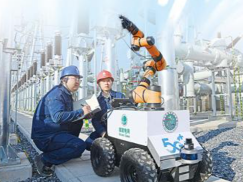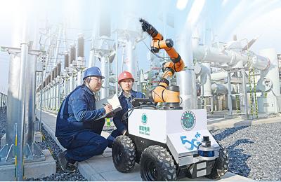 技术人员正在对一台搭载DeepSeek大模型技术的智能巡检机器人进行巡检数据校核。