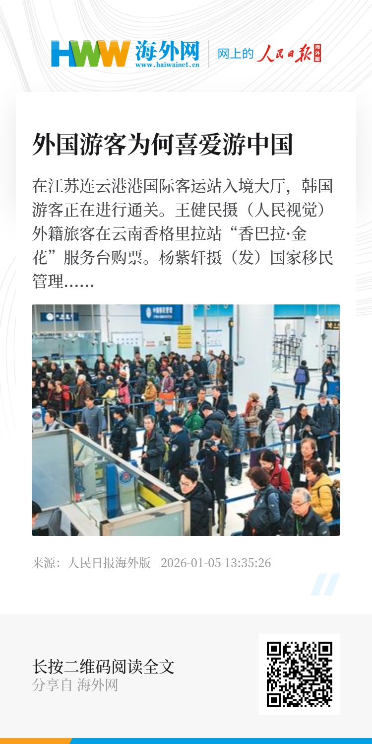 “免签政策激活俄罗斯人赴华旅游热。”俄罗斯《生意人报》网站报道称,中国对俄罗斯持普通护照人员试行免签政策后,俄罗斯人赴华旅游兴趣显著增长。免签是迅速激活中国旅游热度的关键机制。年轻游客对这一新举措的反应最为强烈,这一方向的旅游版图持续拓展,2026年中国的旅游热度将继续走高。