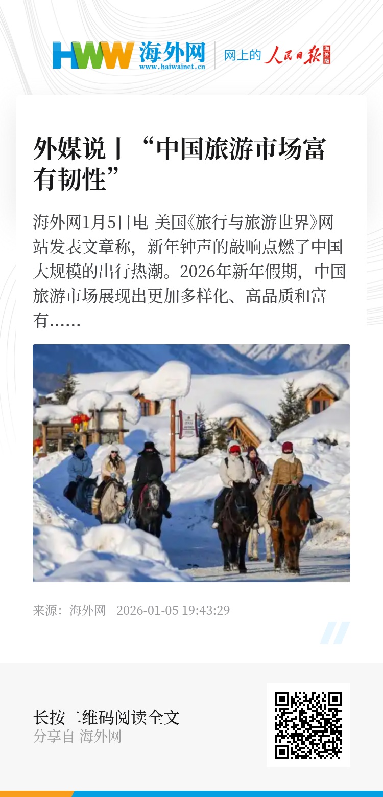 海外网1月5日电 美国《旅行与旅游世界》网站发表文章称,新年钟声的敲响点燃了中国大规模的出行热潮。2026年新年假期,中国旅游市场展现出更加多样化、高品质和富有韧性的特点。