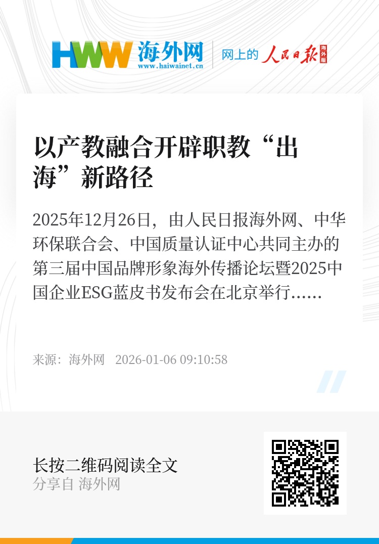 2025年12月26日,由人民日报海外网、中华环保联合会、中国质量认证中心共同主办的第三届中国品牌形象海外传播论坛暨2025中国企业ESG蓝皮书发布会在北京举行。深圳职业技术大学国际交流与合作处处长王冰峰向人民日报海外网表示,“在职教出海的实践中,深圳职业技术大学捕捉全球产业发展动态。例如,中国新能源汽车出口迎来爆发式增长,海外生产基地却普遍面临技术工人短缺的难题,当地相关人才培养更是存在产业匹配度低、专业师资匮乏、实训设施不足等诸多痛点。洞察这一市场需求后,学校顺势而为,将新能源汽车领域列为职教出海的重点方向,主动对接海外产业端的人才需求。”