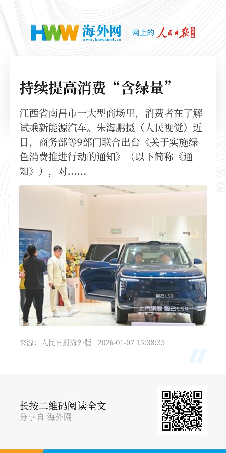 比如,在提高消费的“含绿量”方面,商务部会同国家发展改革委等部门将消费品以旧换新作为推动绿色消费的重要抓手,在政策设计上对高能效的绿色家电、绿色家居、绿色建材和新能源汽车等予以补贴,进一步激发绿色消费需求,畅通绿色消费循环。2024年至2025年,全国报废汽车回收1767.3万辆,年均增速45.8%;规范拆解废旧家电及手机约5300万台,年均增速约12%。