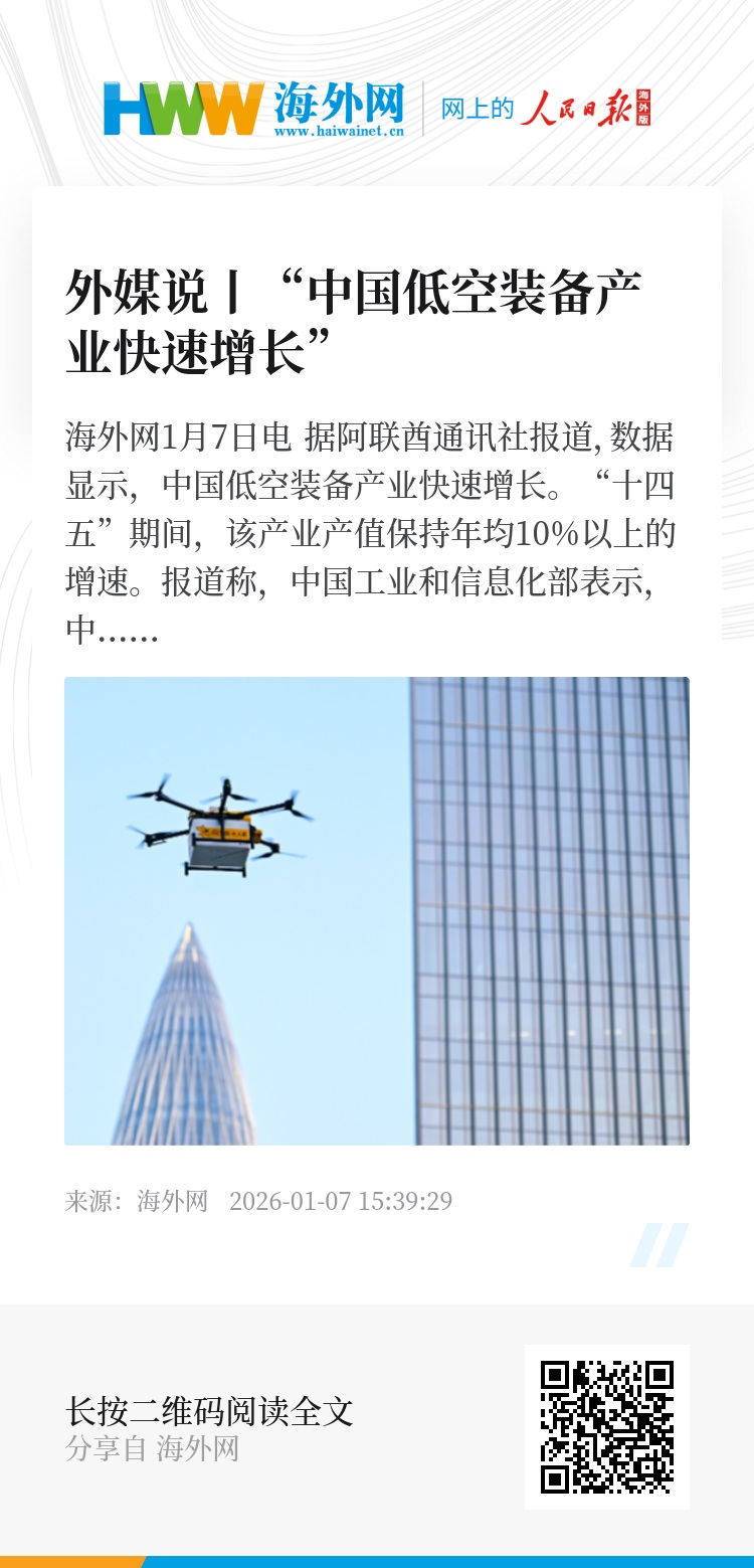海外网1月7日电 据阿联酋通讯社报道,数据显示,中国低空装备产业快速增长。“十四五”期间,该产业产值保持年均10%以上的增速。