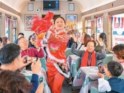 2025年12月28日,游客在黑龙江哈尔滨开往亚布力的旅游列车上观看民俗表演。
