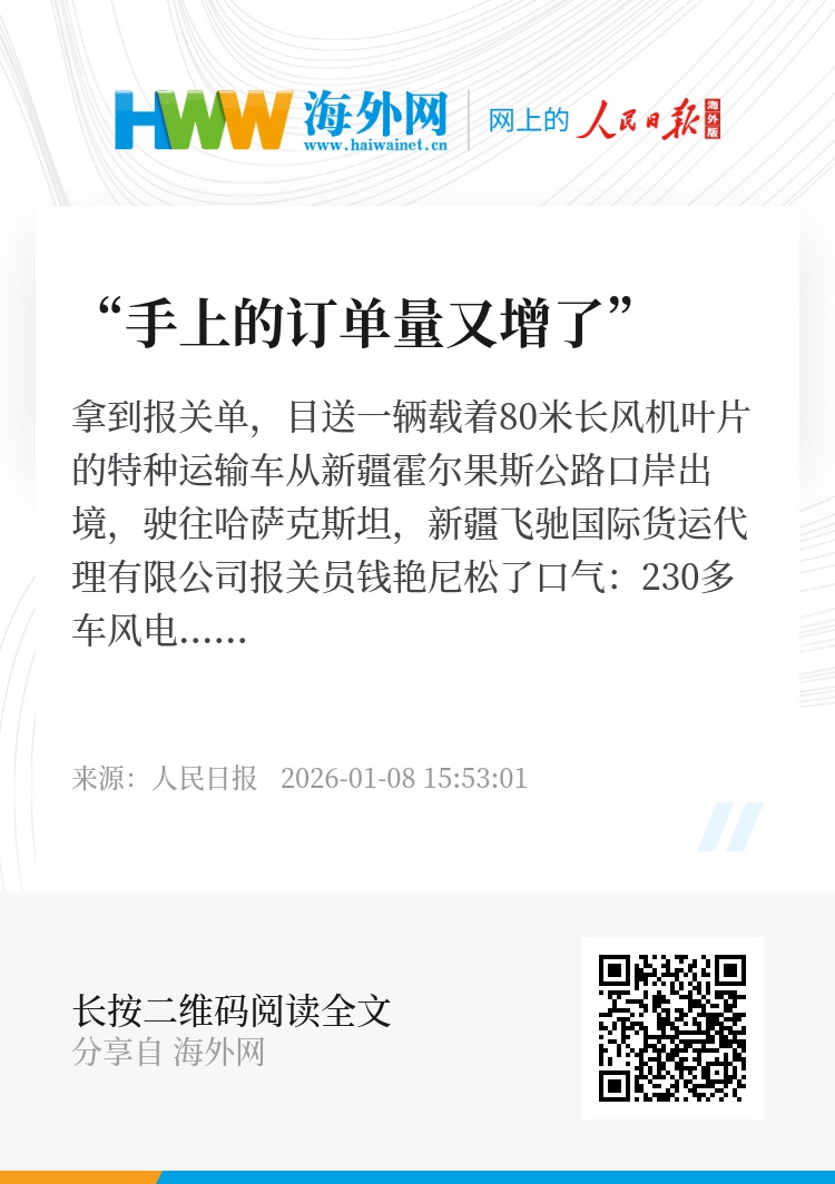 作为新疆出口风电设备的最大口岸,据霍尔果斯海关统计,2025年前11个月,霍尔果斯口岸共出口风电设备948车。(记者 李亚楠)
