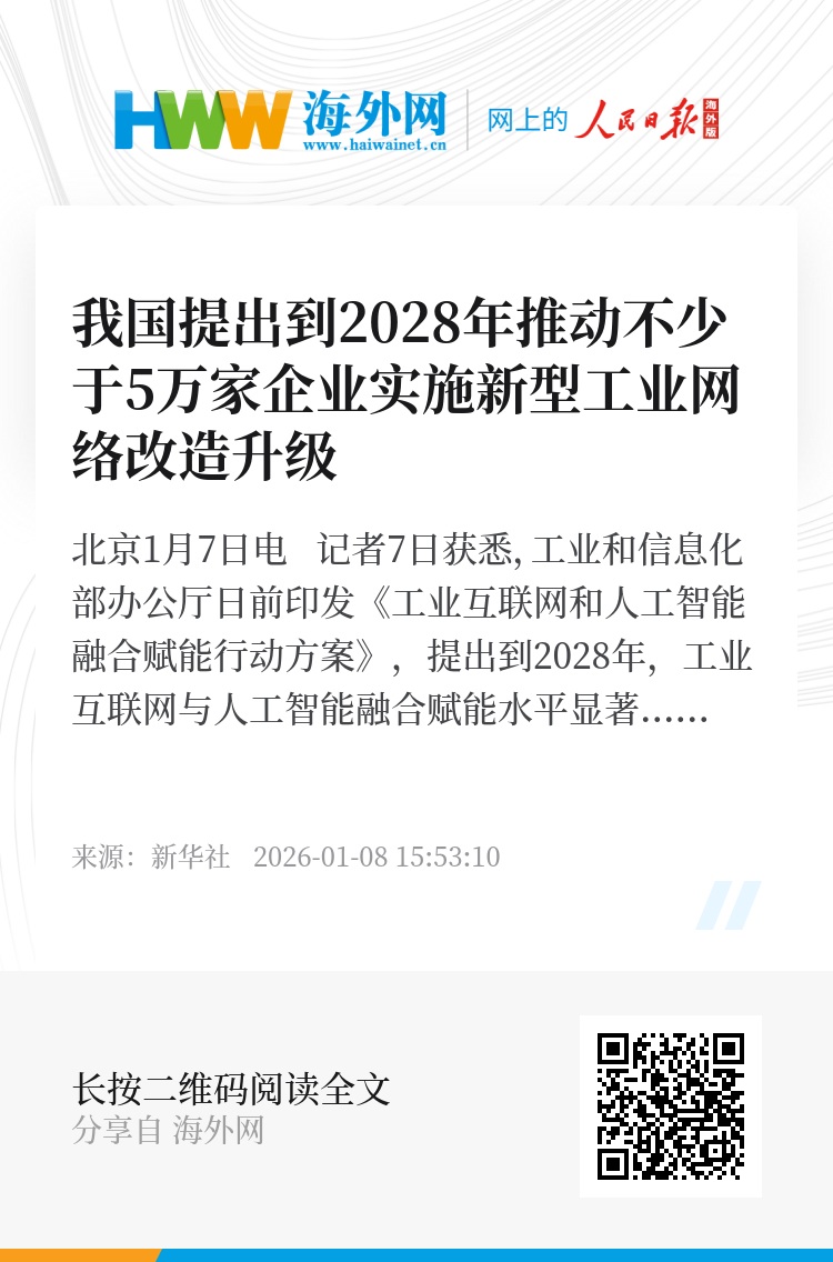 新华社北京1月7日电 记者7日获悉,工业和信息化部办公厅日前印发《工业互联网和人工智能融合赋能行动方案》,提出到2028年,工业互联网与人工智能融合赋能水平显著提升,推动不少于50000家企业实施新型工业网络改造升级,在20个重点行业打造一批高质量数据集,培育一批智能化解决方案供应商。