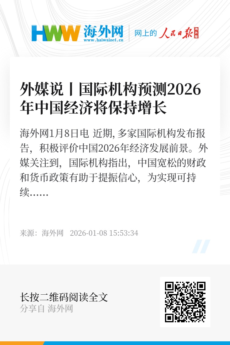 海外网1月8日电 近期,多家国际机构发布报告,积极评价中国2026年经济发展前景。外媒关注到,国际机构指出,中国宽松的财政和货币政策有助于提振信心,为实现可持续经济增长奠定基础。