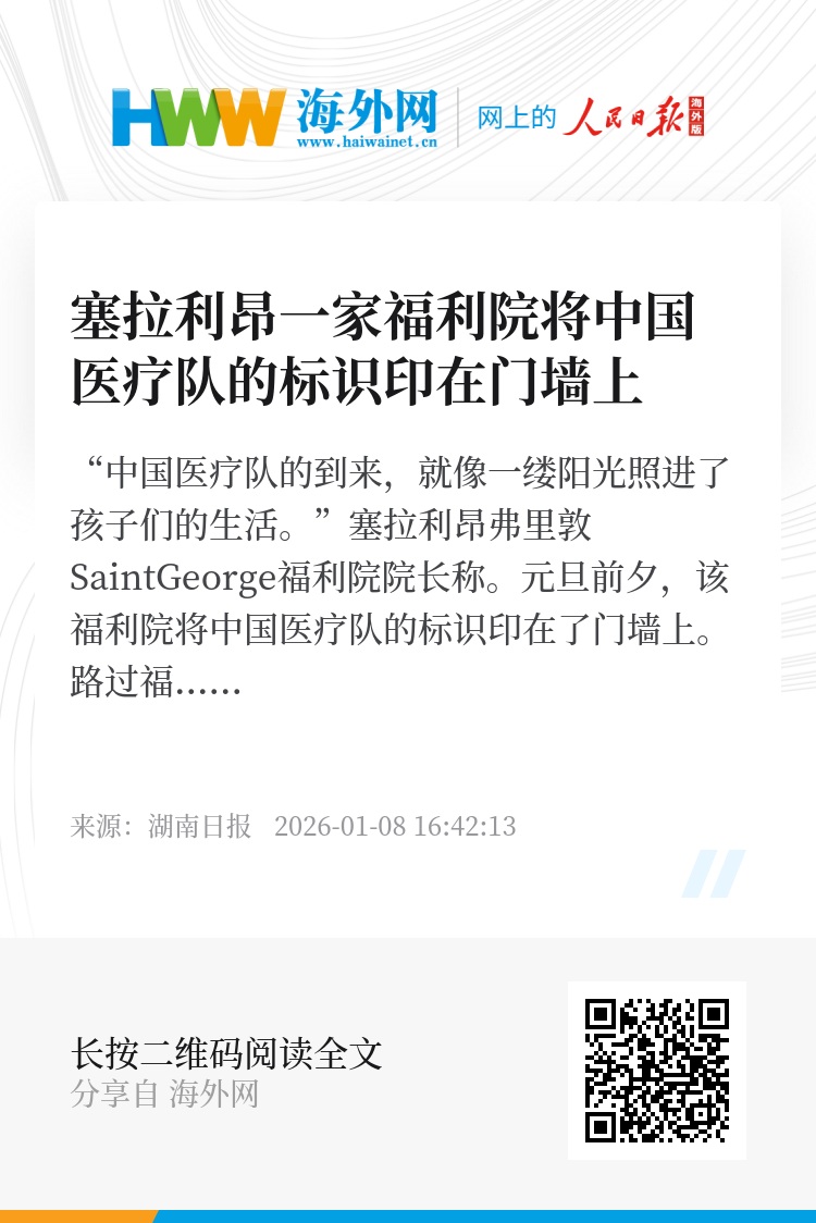 “中国医疗队的到来,就像一缕阳光照进了孩子们的生活。”塞拉利昂弗里敦SaintGeorge福利院院长称。元旦前夕,该福利院将中国医疗队的标识印在了门墙上。路过福利院的人都能看见这枚醒目的标识,感受到这份跨越国界的善意。