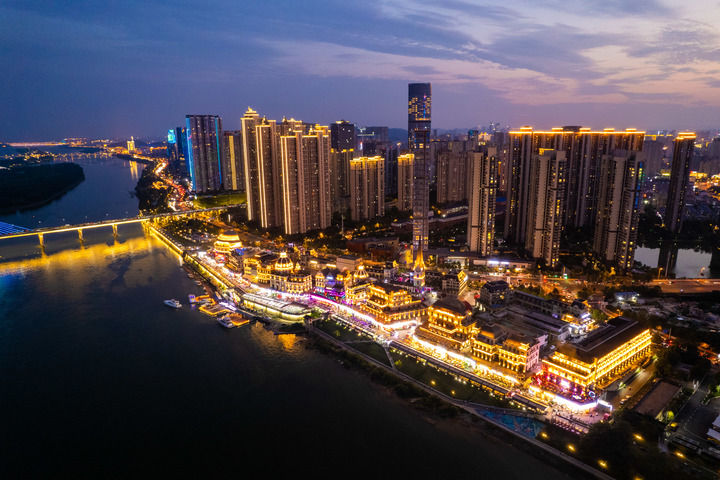 在长沙市岳麓区拍摄的渔人码头夜市。新华社记者 陈思汗 摄