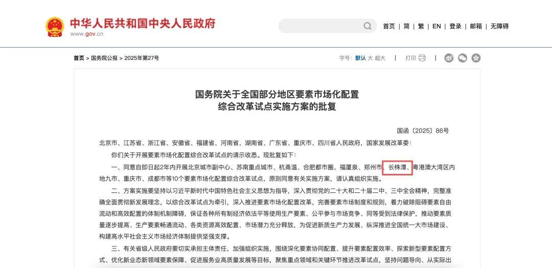 2025年9月11日,国务院批复全国10个要素市场化配置综合改革试点地区,长株潭城市群成为中部地区唯一入选。