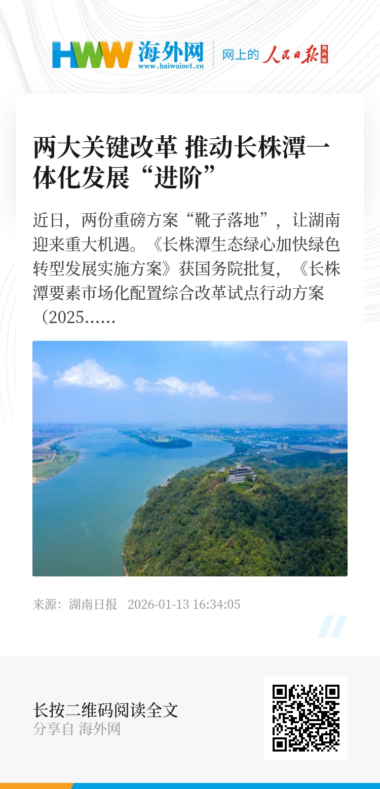 《长株潭生态绿心加快绿色转型发展实施方案》获国务院批复,《长株潭要素市场化配置综合改革试点行动方案(2025—2027年)》正式出台。