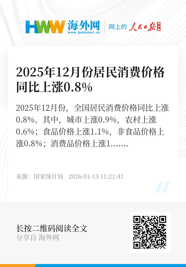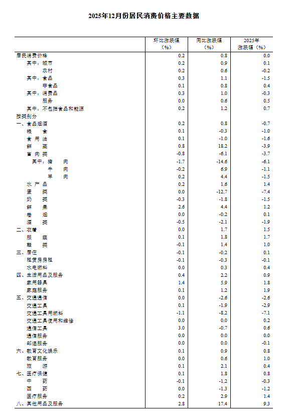 2025年12月份,全国居民消费价格同比上涨0.8%。其中,城市上涨0.9%,农村上涨0.6%;食品价格上涨1.1%,非食品价格上涨0.8%;消费品价格上涨1.0%,服务价格上涨0.6%。