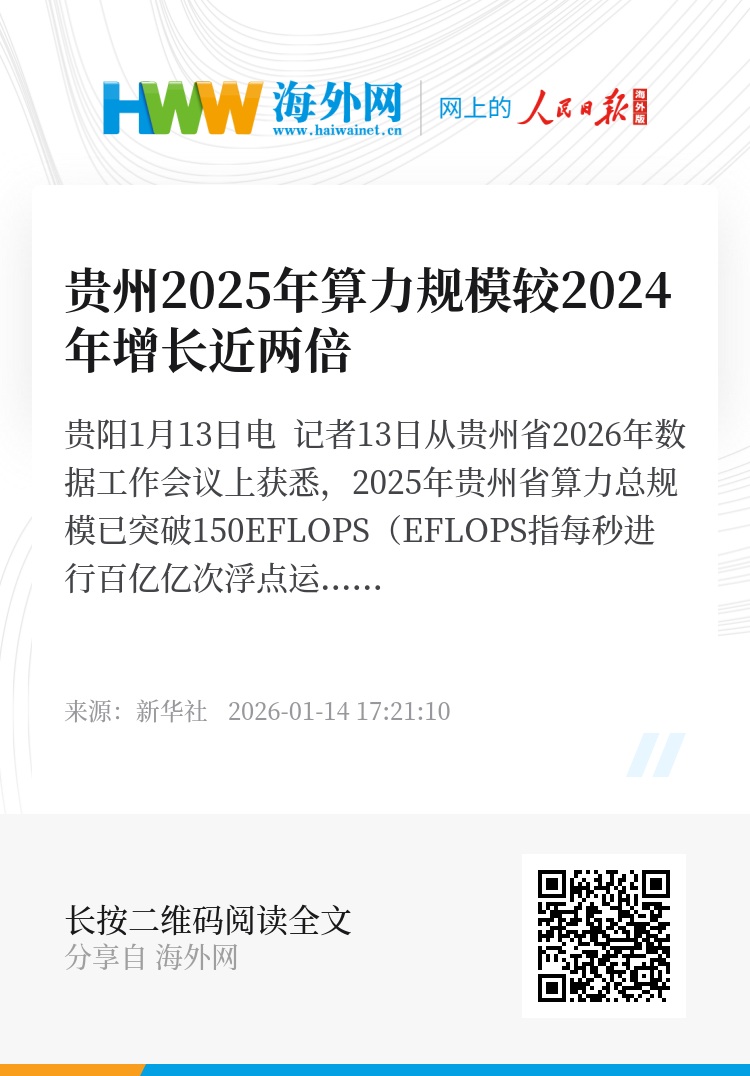 新华社贵阳1月13日电 记者13日从贵州省2026年数据工作会议上获悉,2025年贵州省算力总规模已突破150EFLOPS(EFLOPS指每秒进行百亿亿次浮点运算),较2024年增长近两倍,其中智算占比超过90%。2026年,贵州将推动算力规模提升至190EFLOPS。