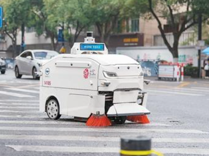 浙江省永康市丽州路人行道上,一台具有垃圾识别、路径规划功能的环卫机器人在自动洗扫路面。