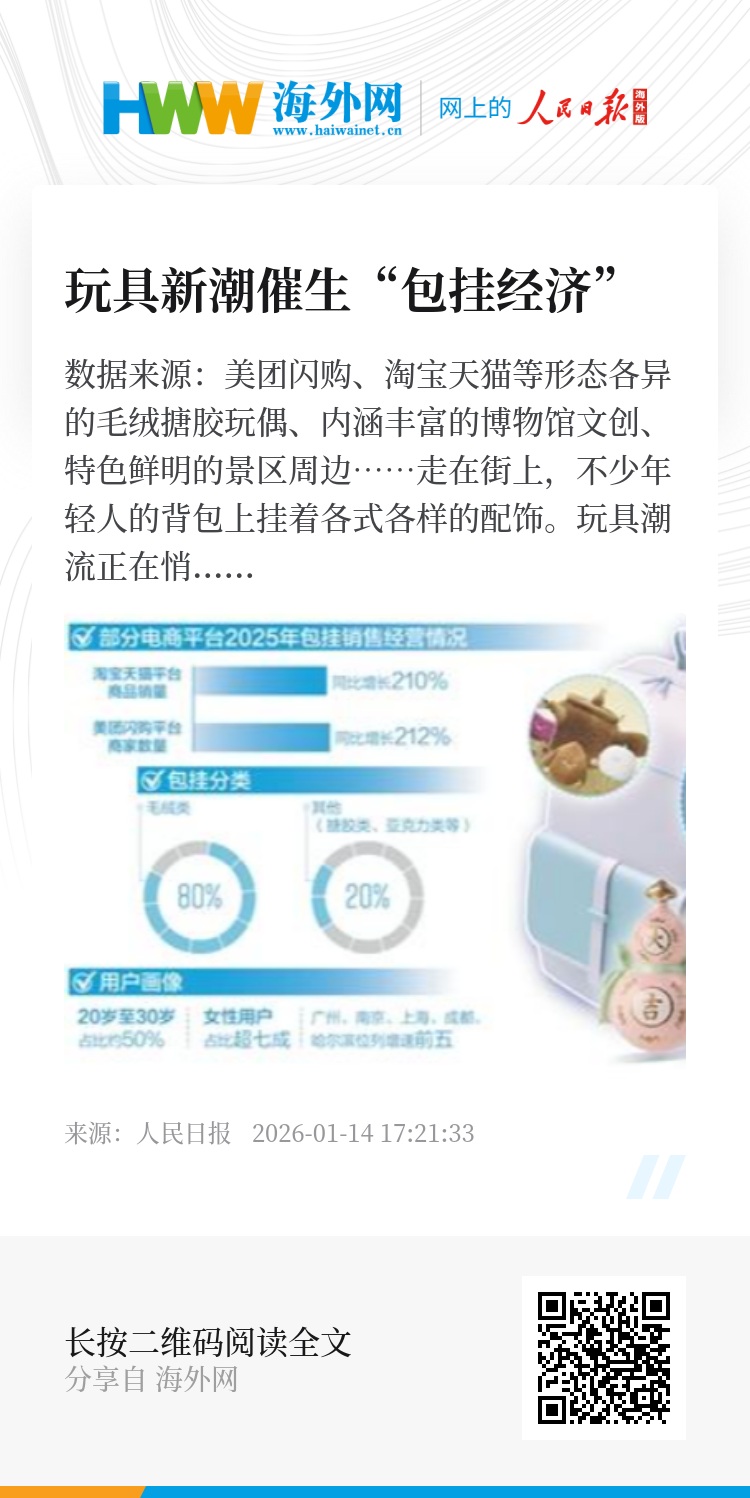 玩具潮流正在悄然改变,从过去“抱着玩”的毛绒玩具、“摆着看”的手办,到尺寸越来越小可以“挂着背”的包挂,具有可移动性和可携带性的包挂越来越受消费者喜爱。造型百变的包挂,从消费端的热度爆发,到产业端的集群支撑,再到“出海”环节的协同赋能,已经形成“包挂经济”。“包挂经济”中藏着怎样的消费密码?记者深入商场和生产企业进行了采访。