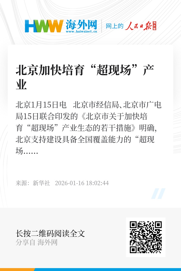 新华社北京1月15日电 北京市经信局、北京市广电局15日联合印发的《北京市关于加快培育“超现场”产业生态的若干措施》明确,北京支持建设具备全国覆盖能力的“超现场”数字视听智控中心,拓展多元化应用场景,构建技术领先、产业协同、生态完善的“超现场”产业高质量发展新格局。