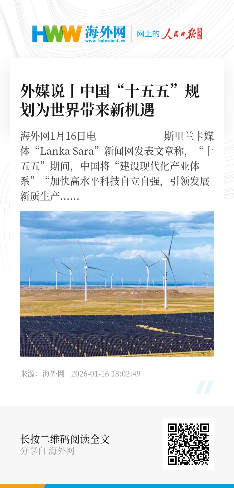海外网1月16日电 斯里兰卡媒体“Lanka Sara”新闻网发表文章称,“十五五”期间,中国将“建设现代化产业体系”“加快高水平科技自立自强,引领发展新质生产力”等,旨在推动塑造更具有韧性的中国经济,以实现可持续增长。中国还将通过扩大内需、提升产业链供应链韧性以及促进制造业投资等,增强全球影响力。