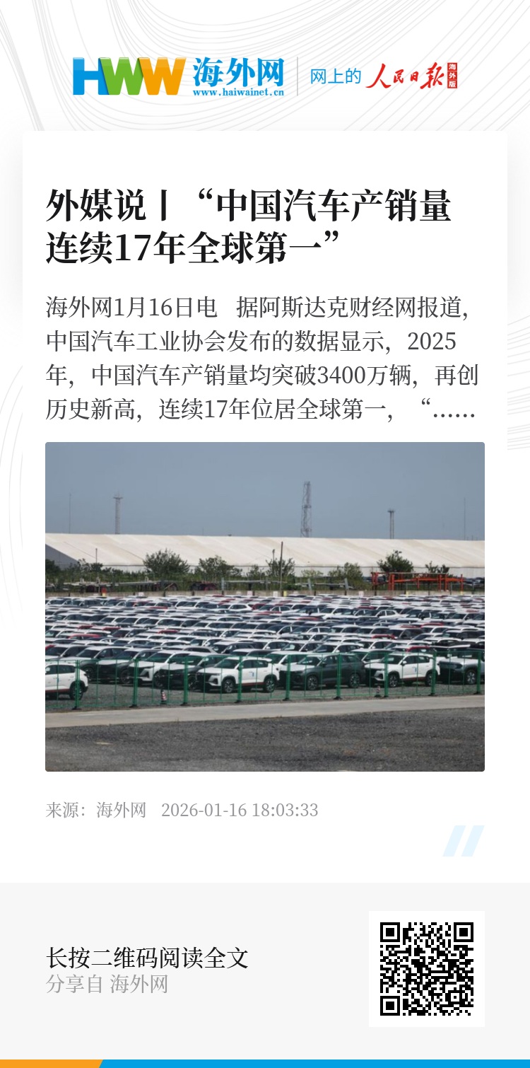 海外网1月16日电 据阿斯达克财经网报道,中国汽车工业协会发布的数据显示,2025年,中国汽车产销量均突破3400万辆,再创历史新高,连续17年位居全球第一,“中国汽车工业继续展现出强大的发展韧性和活力,多项指标再创新高。”新能源汽车的产销量也超过1600万辆,占中国新车总销量的50%以上。