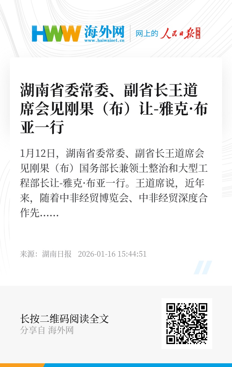 1月12日,湖南省委常委、副省长王道席会见刚果(布)国务部长兼领土整治和大型工程部长让-雅克·布亚一行。