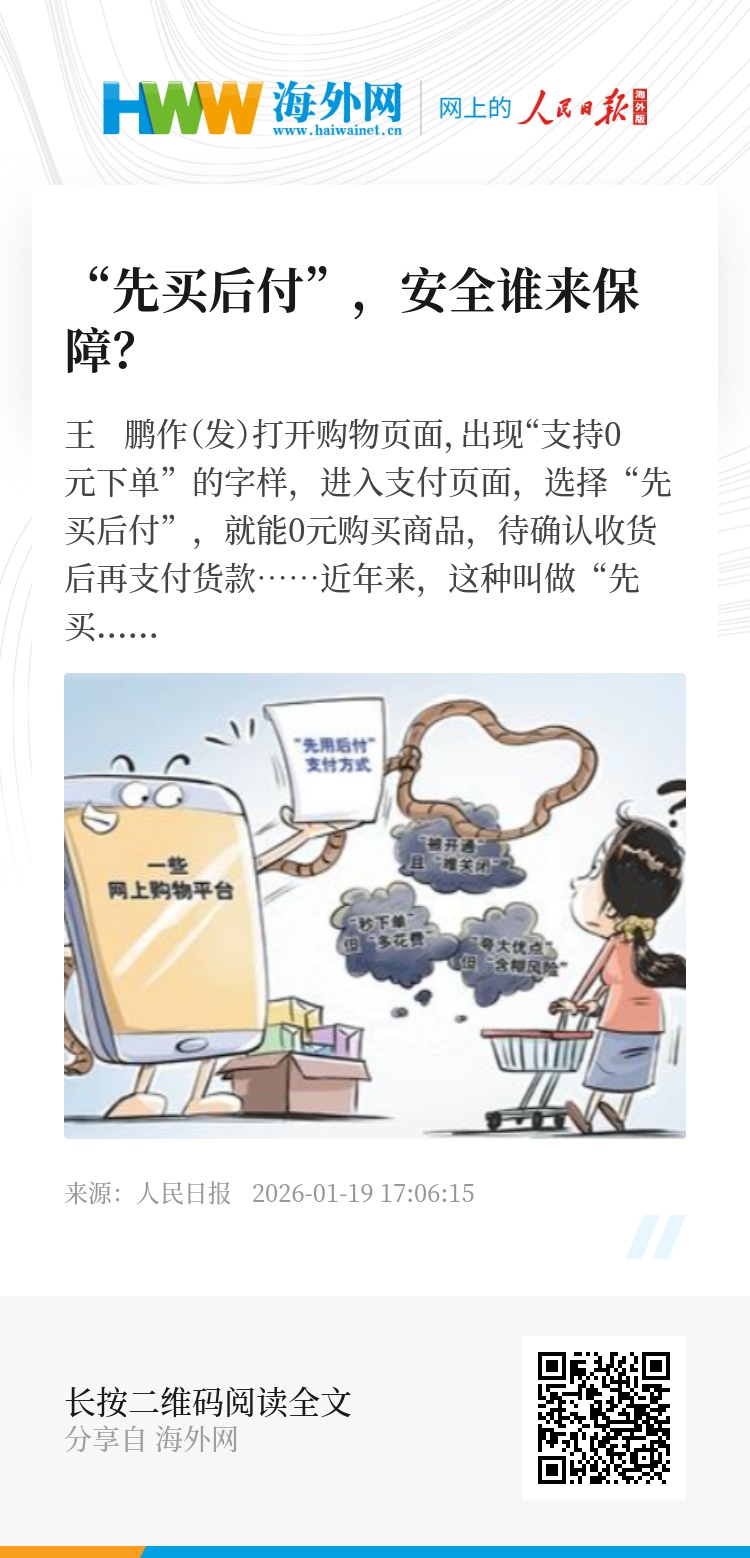 “‘先买后付’服务的核心始终是消费者,便捷的前提是安全,再强大的技术和商业模式也不能代替消费者进行思考和决策。”陈文表示,唯有通过严密的监管、扎实的风控和充分的消费者保护措施,才能让“先买后付”真正成为促消费的“润滑剂”,而非诱发风险与社会问题的“助燃剂”。(记者 武少民 赵展慧 葛孟超)