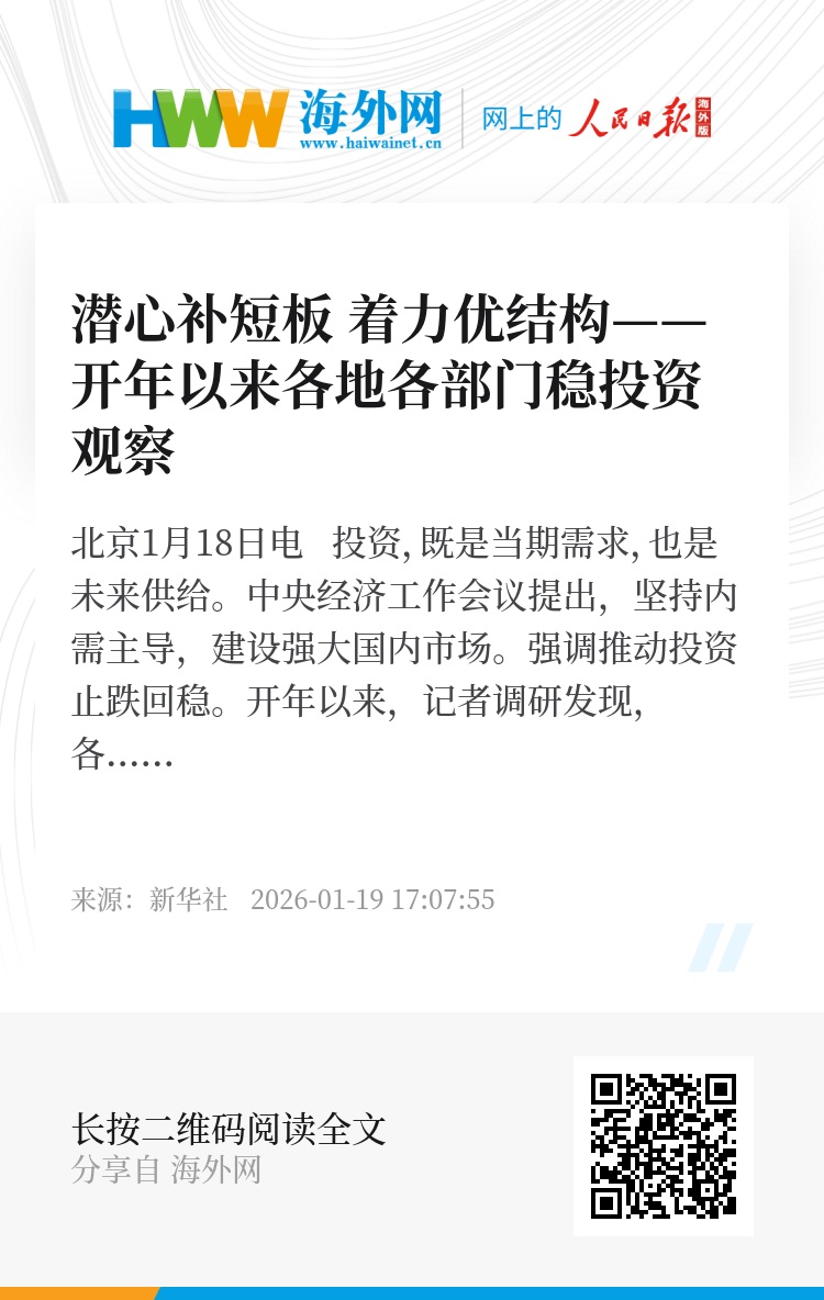 新华社北京1月18日电 投资,既是当期需求,也是未来供给。中央经济工作会议提出,坚持内需主导,建设强大国内市场。强调推动投资止跌回稳。
