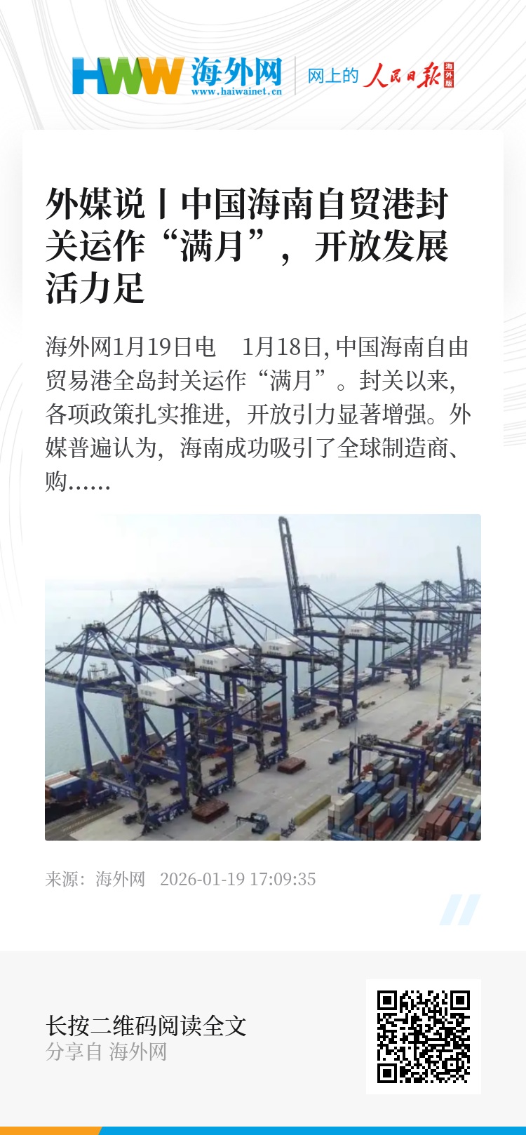 海外网1月19日电 1月18日,中国海南自由贸易港全岛封关运作“满月”。封关以来,各项政策扎实推进,开放引力显著增强。外媒普遍认为,海南成功吸引了全球制造商、购物者和游客,开放发展活力足,当地建设国际旅游消费中心取得显著成效。