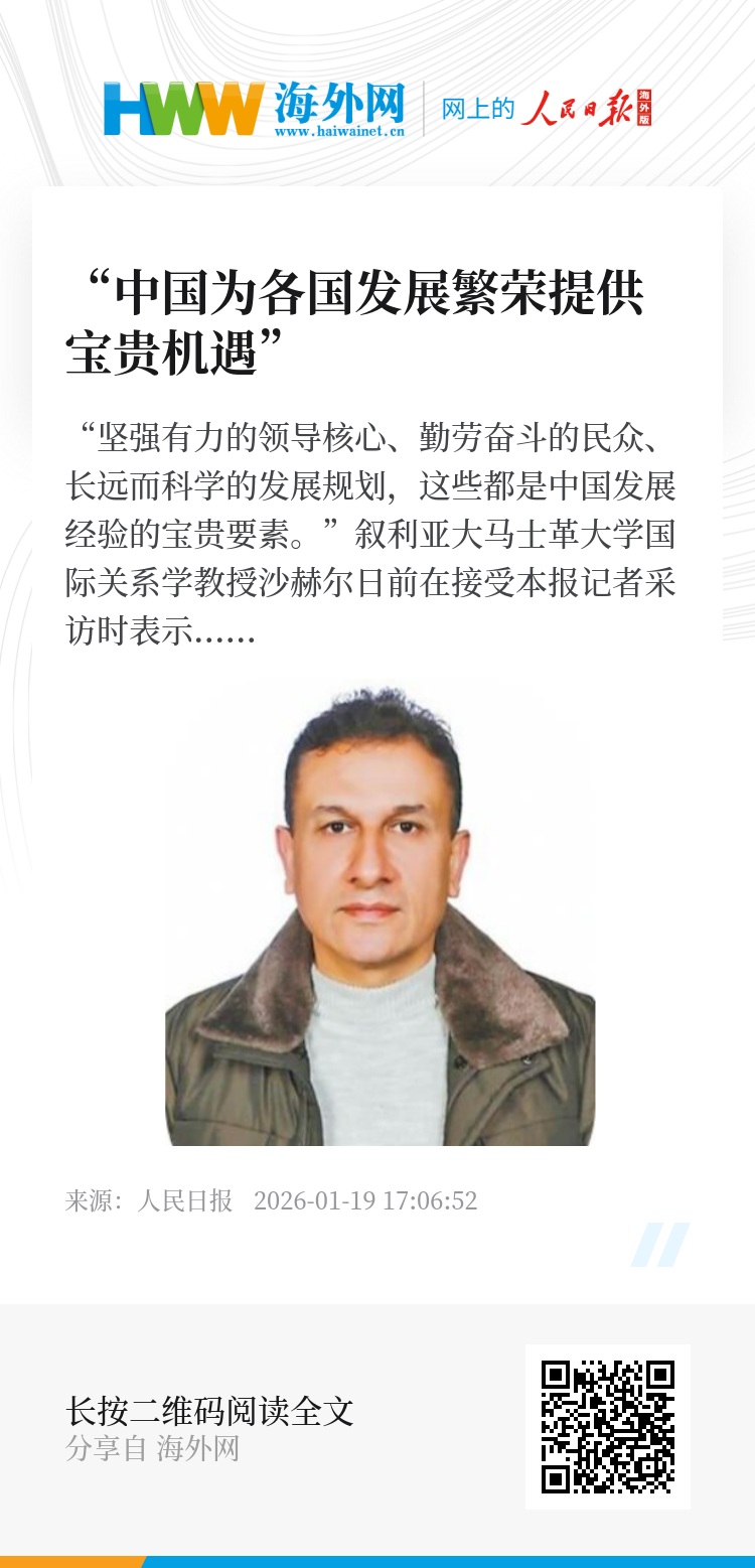 “坚强有力的领导核心、勤劳奋斗的民众、长远而科学的发展规划,这些都是中国发展经验的宝贵要素。”叙利亚大马士革大学国际关系学教授沙赫尔日前在接受本报记者采访时表示,过去几十年间,中国取得的发展成就举世瞩目,中国式现代化进程取得重大成果。中国提出高质量发展,将“发展”提升到了更高、更深的维度。