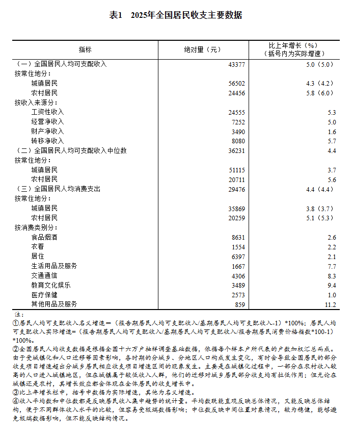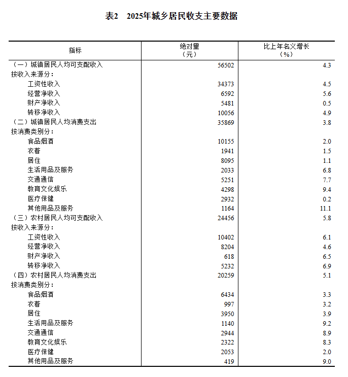 2025年,全国居民人均可支配收入43377元,比上年名义增长5.0%,扣除价格因素,实际增长5.0%。分城乡看,城镇居民人均可支配收入56502元,增长(以下如无特别说明,均为同比名义增长)4.3%,扣除价格因素,实际增长4.2%;农村居民人均可支配收入24456元,增长5.8%,扣除价格因素,实际增长6.0%。