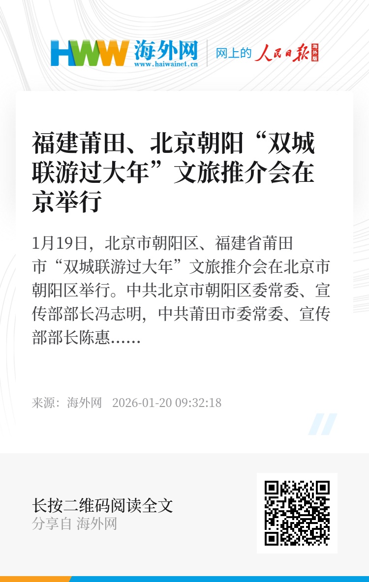 据悉,今年春节元宵期间,福建省莆田市策划开展“全到莆田过大年”活动,精心筹备51项、100场次特色元宵民俗系列活动,将传统祈福文化与多元文旅体验深度融合。北京市朝阳区则准备了一系列文商旅体展活动,涵盖传统庙会、非遗展演、冰雪嘉年华等,尽显烟火气与国际范儿。两地将以此次“双城联游”活动为契机,携手打造跨区域精品线路,推动非遗技艺、文创产品、特色美食的双向赋能,让“过大年”成为联结两地情谊的情感纽带,让文旅合作成为促进区域协同发展的强劲动力。
