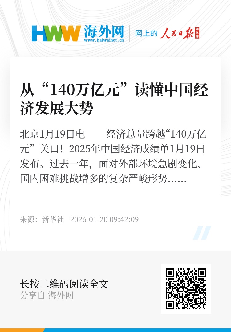 新华社北京1月19日电 经济总量跨越“140万亿元”关口!2025年中国经济成绩单1月19日发布。过去一年,面对外部环境急剧变化、国内困难挑战增多的复杂严峻形势,中国经济依然保持5.0%的增长速度,在主要经济体中名列前茅,这份成绩尤为可贵。“难”与“成”的对照中,显现中国经济高质量发展的大势,蕴含乘风破浪勇往直前的密码。