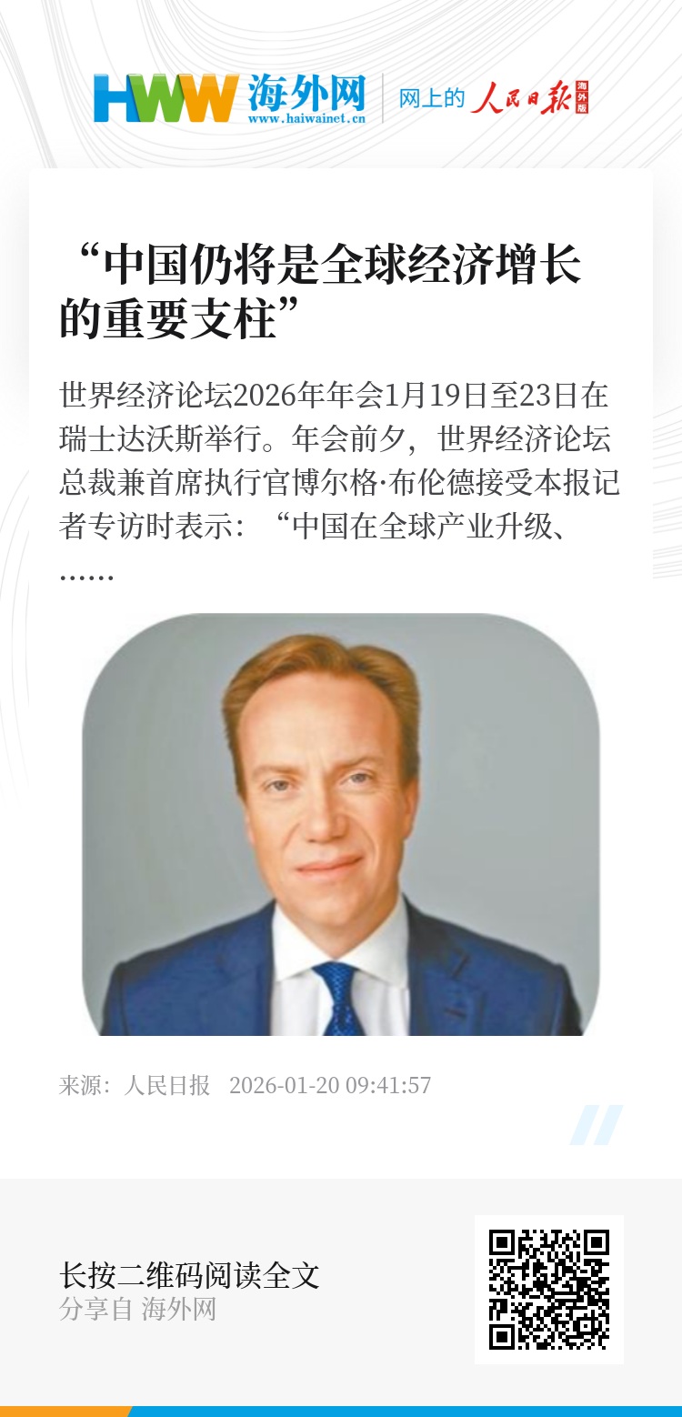 世界经济论坛2026年年会1月19日至23日在瑞士达沃斯举行。年会前夕,世界经济论坛总裁兼首席执行官博尔格·布伦德接受本报记者专访时表示:“中国在全球产业升级、绿色转型等领域发挥着重要作用,中国经济发展持续对世界产生深远影响。我们对中国的未来增长持乐观态度,因为中国不仅有着世界一流的大学体系和完善的基础设施,还在研发和创新方面持续投入。展望2026年,中国仍将是全球经济增长的重要支柱。”