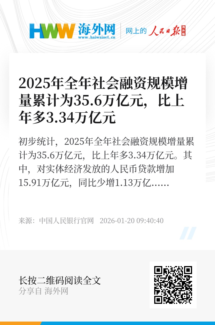 初步统计,2025年全年社会融资规模增量累计为35.6万亿元,比上年多3.34万亿元。其中,对实体经济发放的人民币贷款增加15.91万亿元,同比少增1.13万亿元;对实体经济发放的外币贷款折合人民币减少2043亿元,同比少减1873亿元;委托贷款增加1203亿元,同比多增1780亿元;信托贷款增加3682亿元,同比少增294亿元;未贴现的银行承兑汇票增加112亿元,同比多增3405亿元;企业债券净融资2.39万亿元,同比多4825亿元;政府债券净融资13.84万亿元,同比多2.54万亿元;非金融企业境内股票融资4763亿元,同比多1863亿元。