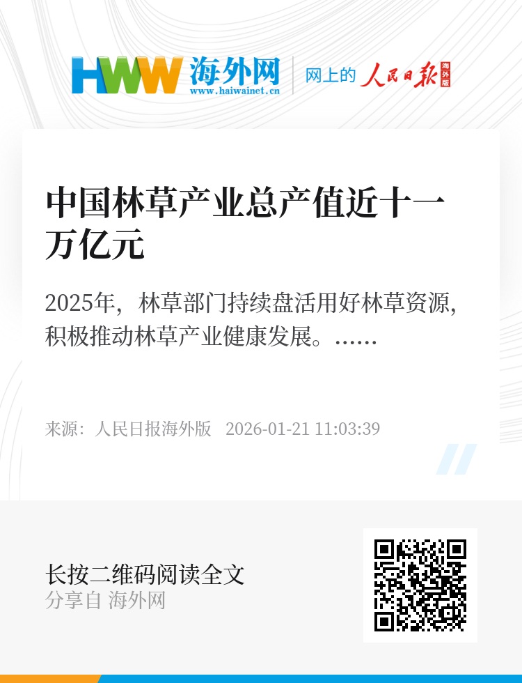 日前从全国林业和草原工作会议上获悉,2025年,中国持续推进集体林权制度改革和林草产业高质量发展,全国林草产业总产值近11万亿元,林产品进出口贸易总额超1800亿美元。森林食物年产量达2.4亿多吨。
