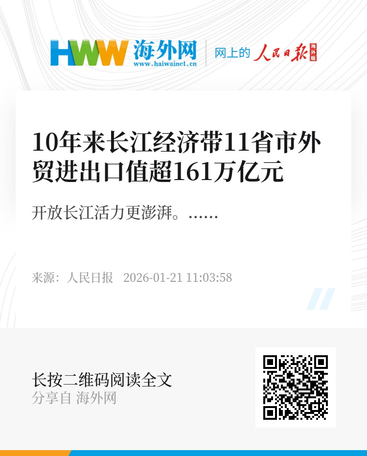 人民日报北京1月20日电 长江经济带发展是我国区域重大战略。据南京海关统计:10年来,长江经济带11省市外贸进出口值161.63万亿元,占全国进出口总值的45.2%。其中,10年来,江苏省外贸进出口47.93万亿元,位列长江经济带首位。