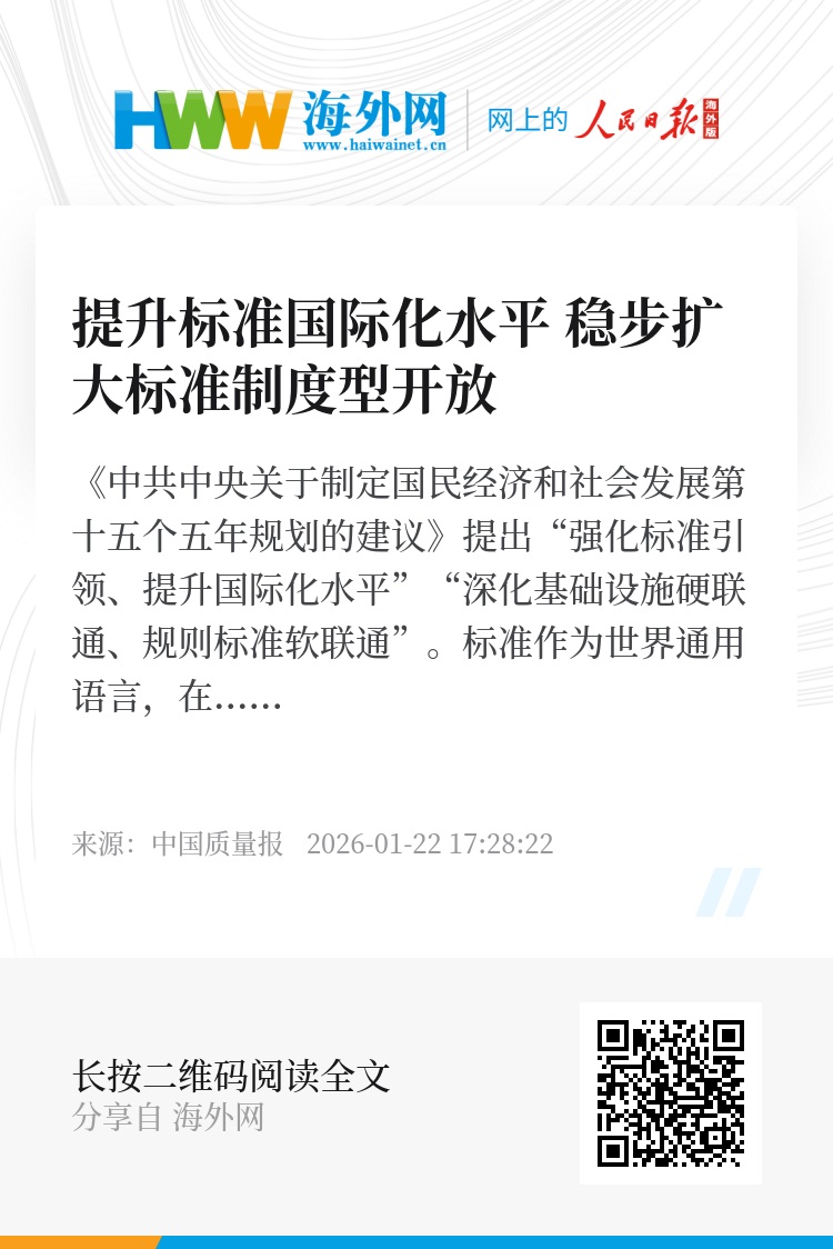 《中共中央关于制定国民经济和社会发展第十五个五年规划的建议》提出“强化标准引领、提升国际化水平”“深化基础设施硬联通、规则标准软联通”。标准作为世界通用语言,在推动科技创新、促进国际交流、便利贸易往来等方面,发挥着越来越重要的作用。标准国际化不仅是制度型开放的核心内容,联通国内市场与国际市场的关键纽带,更是我国参与全球治理,提升国际影响力与竞争力的战略选择。