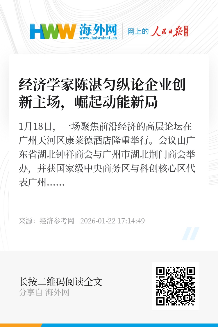 1月18日,一场聚焦前沿经济的高层论坛在广州天河区康莱德酒店隆重举行。会议由广东省湖北钟祥商会与广州市湖北荆门商会举办,并获国家级中央商务区与科创核心区代表广州天河区众创孵化促进会共同支持。论坛特邀经济学家陈湛匀发表主旨演讲,深入阐释国家“坚持创新驱动,加紧培育壮大新动能”的战略内涵(见下图)。他指出,我们正身处第四次工业革命的浪潮中心,这是一场以技术融合与生态对决为核心的系统性变革。在此背景下,驱动创新落地的关键在于筑牢企业创新主体地位——唯有激活企业这一市场经济的“原生细胞”,新动能的崛起方有坚实根基。