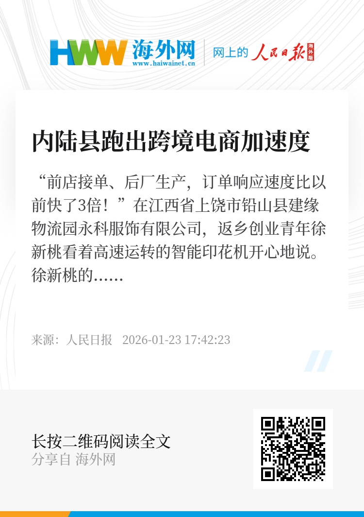 “前店接单、后厂生产,订单响应速度比以前快了3倍!”在江西省上饶市铅山县建缘物流园永科服饰有限公司,返乡创业青年徐新桃看着高速运转的智能印花机开心地说。徐新桃的网店深耕国内外平台,借助园区“前店后厂+垂直产业链”模式,2025年销售额突破1200万元。