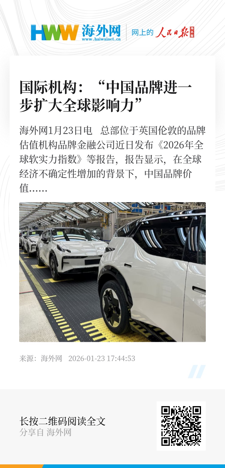 海外网1月23日电 总部位于英国伦敦的品牌估值机构品牌金融公司近日发布《2026年全球软实力指数》等报告,报告显示,在全球经济不确定性增加的背景下,中国品牌价值与软实力跻身全球前列。