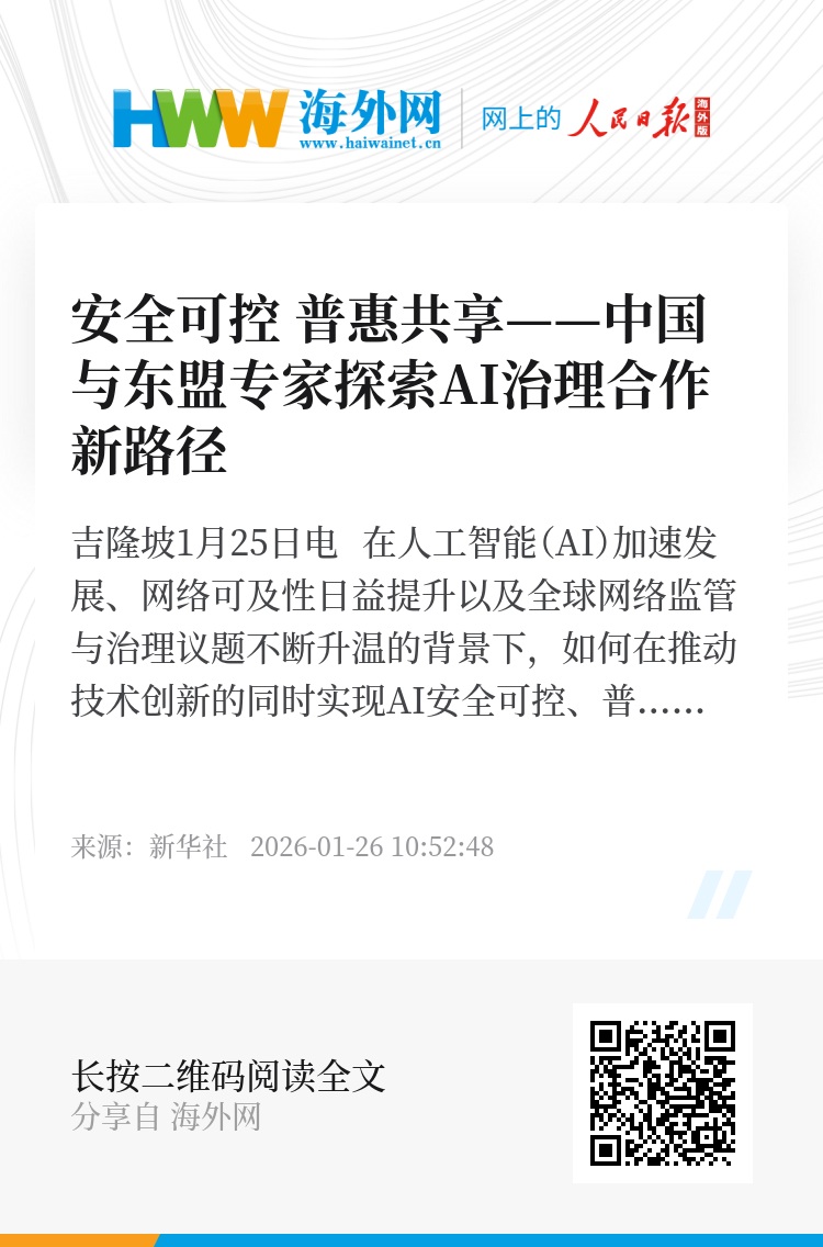 新华社吉隆坡1月25日电 在人工智能(AI)加速发展、网络可及性日益提升以及全球网络监管与治理议题不断升温的背景下,如何在推动技术创新的同时实现AI安全可控、普惠共享,成为国际社会需要共同面对的重要课题。
