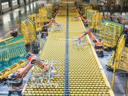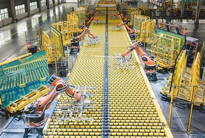 江苏省宿迁市宿豫区一家新材料公司生产车间内,工业机器人在生产线上自动堆垛玻璃产品。
