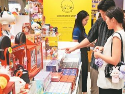 图为2025年5月19日,顾客在泰国曼谷尚泰世界购物中心的泡泡玛特门店选购商品。