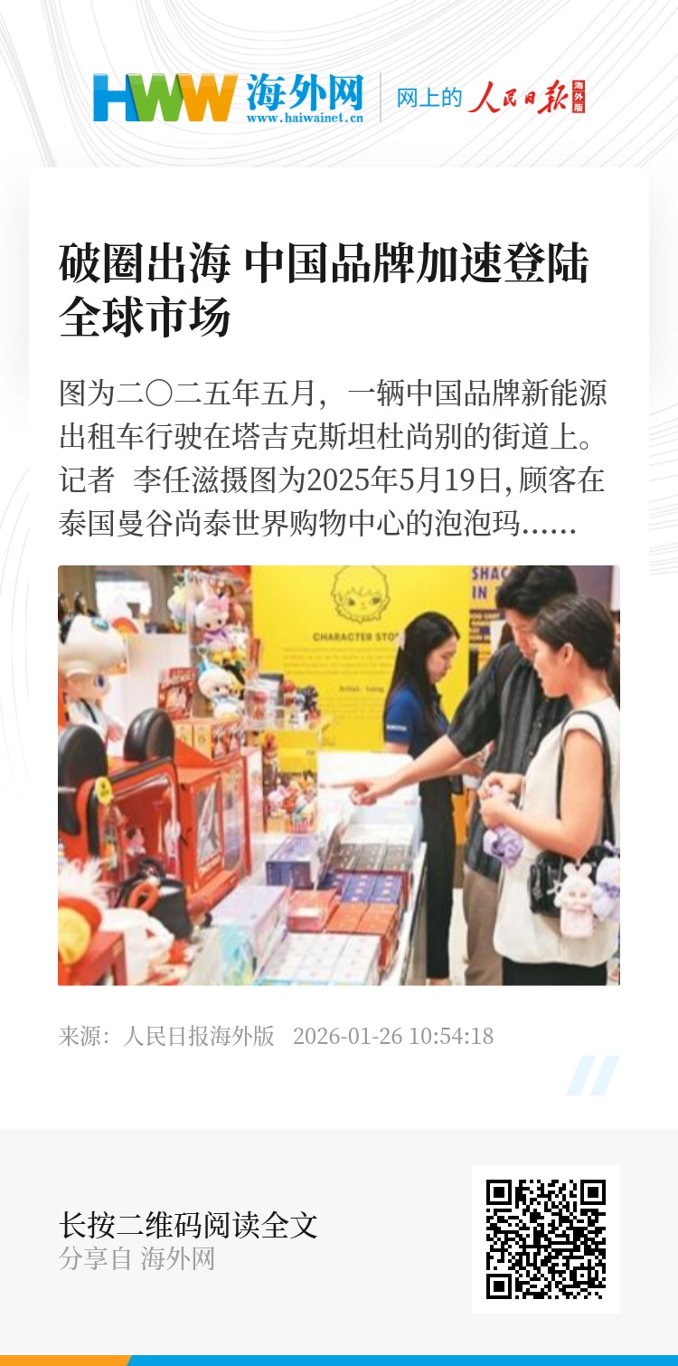 美国《福布斯》杂志网站近日刊文称,新的一年,中国品牌将进一步走向全球。“2026年,世界要准备好迎接中国品牌崛起。中国品牌有很好的品质、优秀的品牌管理。它们将登陆世界各地。”
